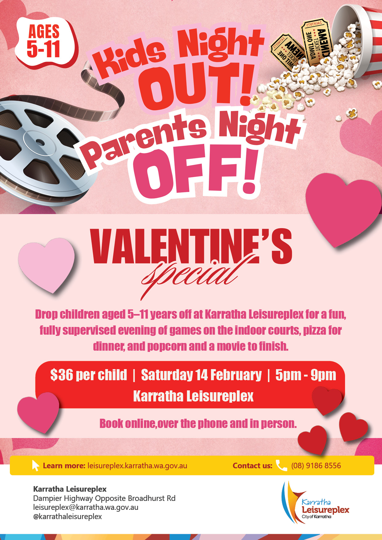 Drop children aged 5–11 years off at Karratha Leisureplex for a fun, fully supervised evening of games on the indoor courts, pizza for dinner, and popcorn and a movie to finish.